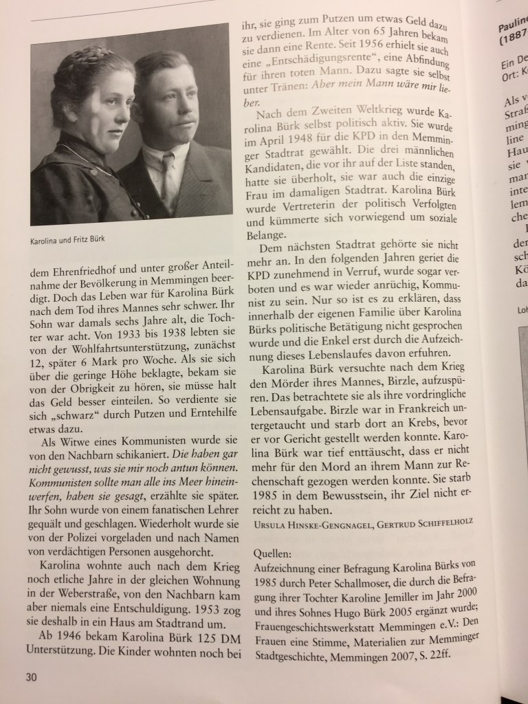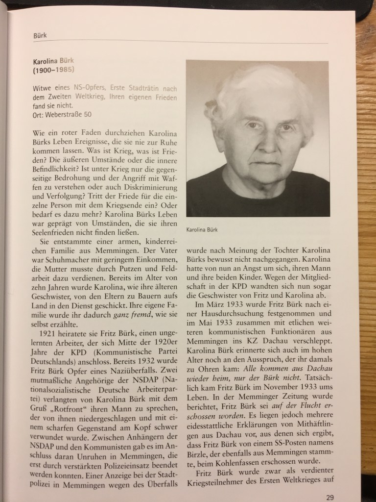 Karolina Bürk ist sicher eine bewununderswerte Frau und was die politische Haltung betrifft sicher eines meiner Vorbilder. Ihr Mann wurde schon 1933 von den Nazis ermordet, sie wurde während der ganzen 12 Jahre von den Nachbarn schikaniert, ihr Sohn von einem fanatischen Lehrer gequält und geschlagen, sie öfters verhaftet. Trotzdem hatte sie die Kraft, nach dem Krieg politisch aktiv zu werden und für die KPD als Frau in den Memminger Stadtrat gewählt zu werden und dort für die Belange der Verfolgten und sozial Schwachen einzutreten.