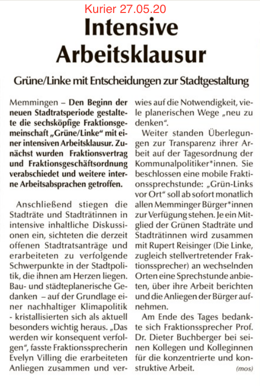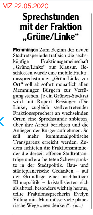 Weiter standen Überlegungen zur Transparenz ihrer Arbeit auf der Tagesordnung der Kommunalpolitiker*innen und beschlossen eine mobile Fraktionssprechstunde: „Grün-Links vor Ort“ soll ab sofort monatlich allen Memminger Bürger*innen zur Verfügung stehen. Je ein Mitglied der Grünen Stadträt*innen wird zusammen mit Rupert Reisinger (Die Linke, zugleich stellvertretender Fraktionssprecher) an wechselnden Orten eine Sprechstunde anbieten, über ihre Arbeit berichten und die Anliegen der Bürger*innen aufnehmen.