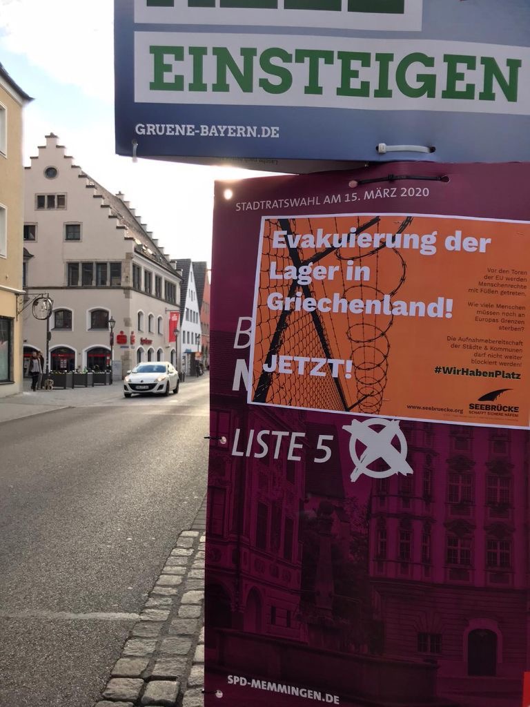 Um in Zeiten, in denen Demonstrationen und Kundgebungen weder erlaubt noch sinnvoll sind, auf dieses Thema und den massiven Handlungsdruck aufmerksam zu machen, haben wir uns entschieden, Plakate zu nutzen. In Memmingen, Woringen, Ottobeuren, Kempten und Bad Grönenbach haben wir, mit Erlaubnis einiger Parteien, Wahlplakate genutzt, um darauf Plakate der Seebrücken Initiative anzubringen. Wir hoffen, diese Aktion trägt dazu bei die Menschen auf der Flucht nicht in Vergessenheit zu geraten lassen. Die Verantwortlichen müssen zum Umdenken und Handeln bewegt werden.