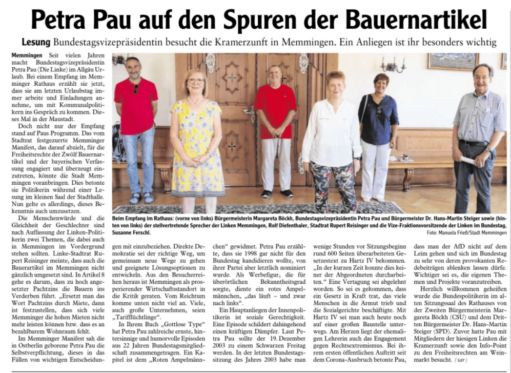 Petra Pau war in Memmingen und ist jetzt wohl wieder in Berlin angekommen. Einen Urlaubstag stellt sie immer einer Organisation der Linken im Allgäu zur Verfügung. Dieses Jahr war es Memmingen,