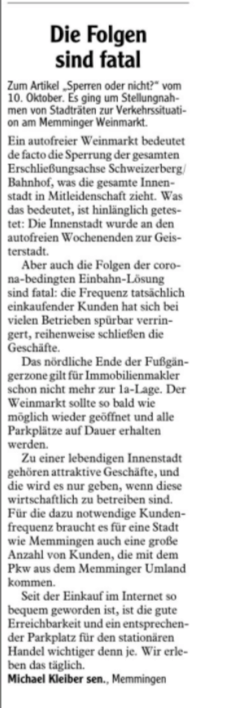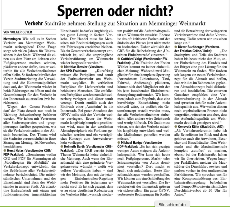 Am Dienstag den 03.11.2020 war eine Klausursitzung des Stadtrates zum Thema Weinmarkt. Die Diskussion um den Weinmarkt beschäftigt die Memminger Bürger*innen (siehe Leserbriefe unten). Aber es geht unserer Meinung nach nicht nur um den Weinmarkt. Memmingen braucht insgesamt eine zukunftsfähige Verkehrspolitik und dazu braucht es auch Mut.