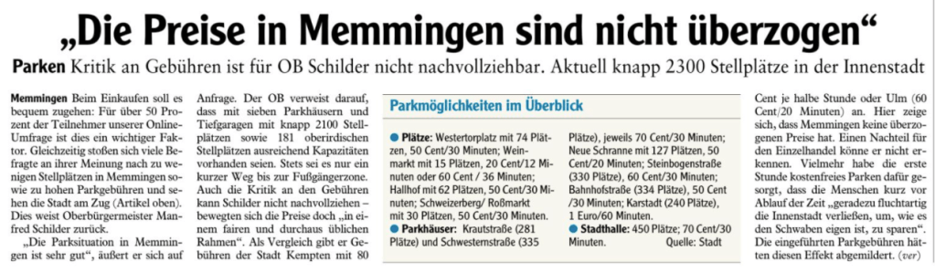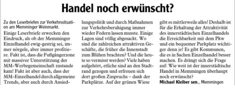 - nochmal Einzelhandel: das große Problem für den Einzelhandel ist zum einen der Internethandel (das ist nicht in der Verantwortung der Stadt und die Einzelhändler müssten aktiver und kreativer darauf reagieren) und zum anderen das Gewerbegebiet im Memminger Norden (das liegt jetzt in der Verantwortung der Stadt), wo die Menschen Alles bekommen – ohne Parkplatzsuche. Der Einzelhandel kann da nicht mit einigen wenigen Parkplätzen und der Durchfahrt zum Weinmarkt konkurrieren.