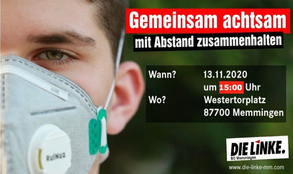 Unter dem Motto „Gemeinsam achtsam – mit Abstand zusammenhalten“ sind am Freitag den 13.11.2020 die Bürger:innen um 15:30 Uhr auf dem Parkplatz am Westertorplatz eingeladen. Alle die mit uns gemeinsam zeigen wollen das gerade in der aktuellen Ausnahmesituation, Solidarität und Zusammenhalt unser wichtigstes Gut sind laden wir ein teilzunehmen. Der persönliche Egoismus muss nach Meinung der Linken in diesen Zeiten vor allem zum Schutz der Risikogruppen zurückgestellt werden. In Memmingen soll kein Platz für Verschwörungsideologien sein, die die Situation ausnutzen und zur Spaltung der Gesellschaft beitragen. „Wir sind der Überzeugung, dass die gegenwärtige Pandemie nur durch Solidarität und Rücksichtnahme gemeinsam gelöst werden kann, deshalb gehen wir auf die Straße“, so Tatjana Ewert vom Vorstand der Linken. Es werden die aktuellen Corona-Regeln beachtet: nur mit Maske und Abstand. Die Zahl der Teilnehmer:innen wird deshalb auf 50 Personen beschränkt bleiben.