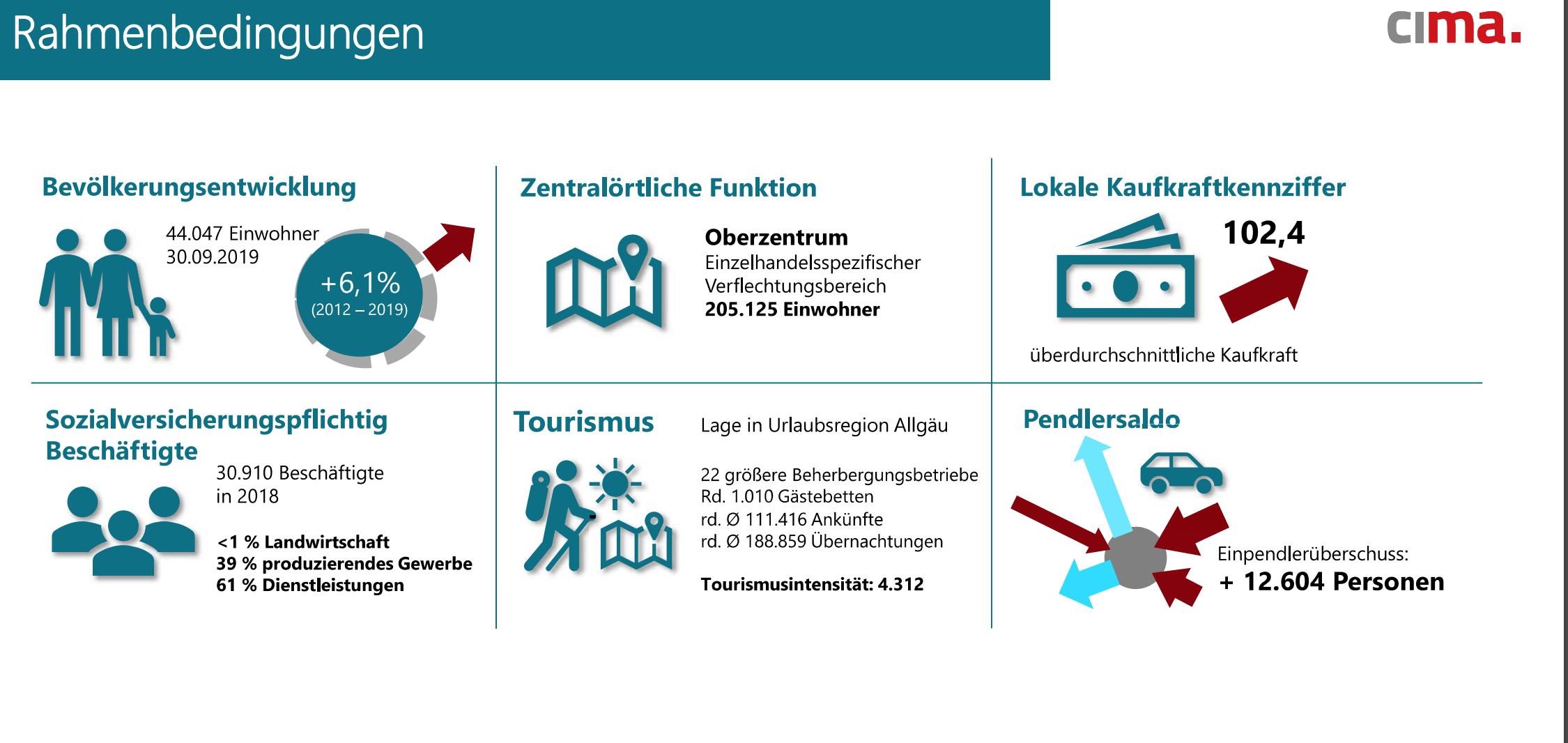 Die sechs untersuchten Rahmenbedingungen für Memmingen sind gut. Die Bevölkerung entwickelt sich, der Tourismus nimmt zu, Das Pendlersaldo ist positiv, die Kaufkraftkennziffer ist über 100. (HIER Erklärung zu dieser Ziffer)