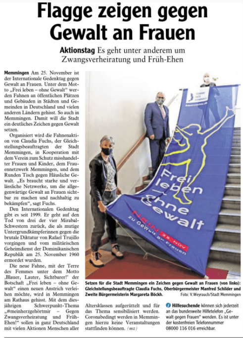 Vor 55 Jahren haben die drei Schwestern Patria, Minerva und Maria Theresia Mirabal für ein gewaltfreies Leben und für den Kampf gegen jegliches Unrecht an Frauen ihr Leben lassen müssen. Seitdem wird der 25. November weltweit als „Internationaler Tag gegen Gewalt an Frauen“ begangen. Gewalt an Frauen hat viele Gesichter und macht auch vor Grenzen keinen Halt. Laut UNO wird immer noch jede dritte Frau einmal in ihrem Leben geschlagen, vergewaltigt oder anderweitig missbraucht.