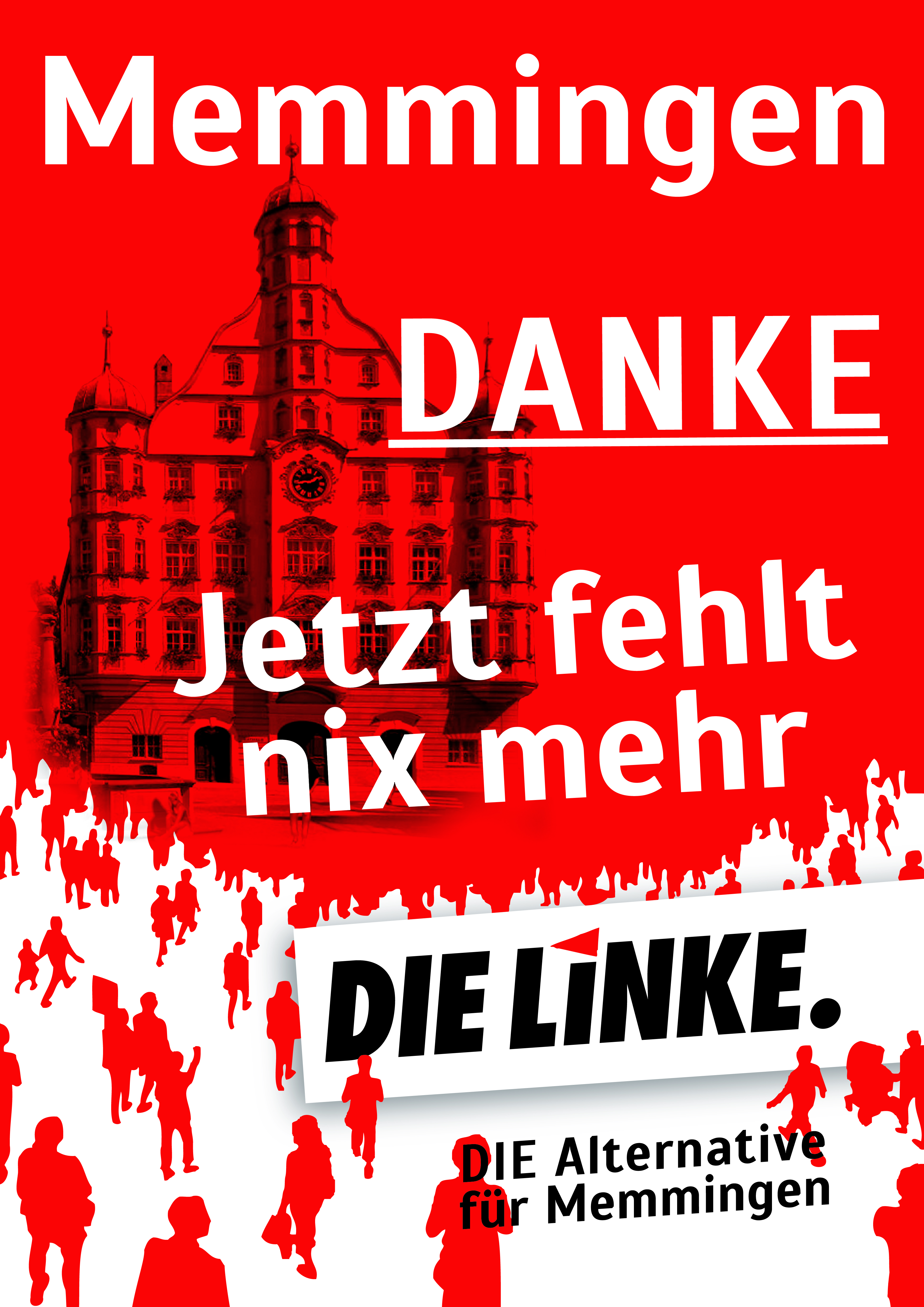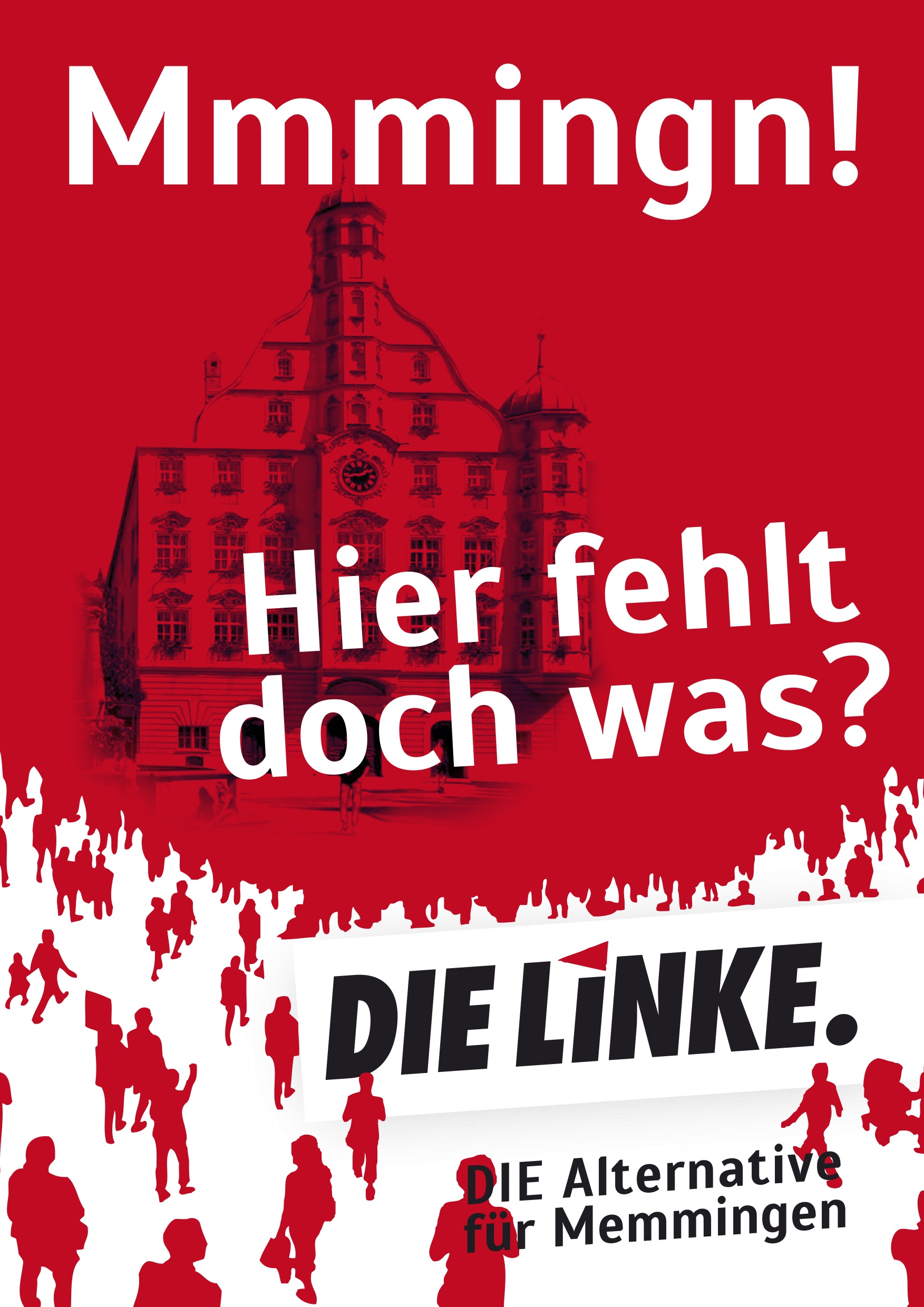 Unser Wahlkampf war großartig – hier noch einen herzlichen Dank an alle, die mitgekämpft und uns unterstützt haben. Viel Aufmerksamkeit erregte unser Wahlkampfplakat „Hier fehlt doch was?“. Nicht nur dass bei Memmingen die zwei „e“ fehlten, unser Grafiker hat auch beim Memminger Rathaus das LINKE Türmchen entfernt (was uns allen nicht aufgefallen ist – bei „jetzt fehlt nix mehr – ist das Türmchen wieder dran – eine super Idee!).