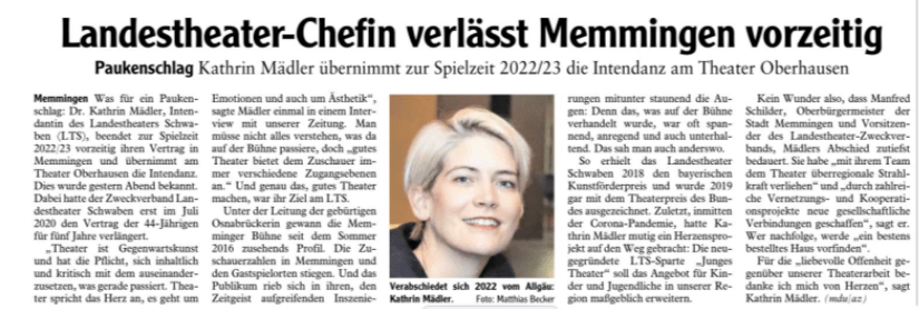 Die Intendantin des Landestheaters Schwaben Kathrin Mädler verlässt Memmingen 2022 und übernimmt die Intendanz in Oberhausen.