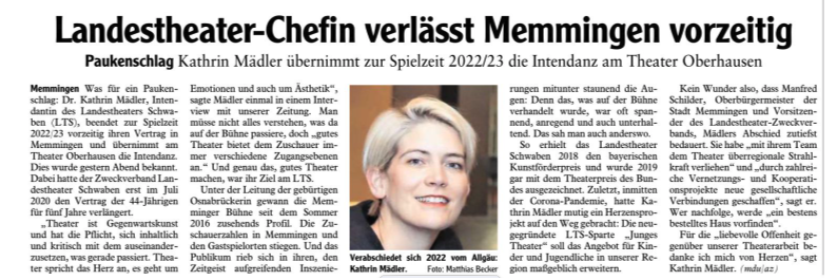 Die Intendantin des Landestheaters Schwaben Kathrin Mädler verlässt Memmingen 2022 und übernimmt die Intendanz in Oberhausen.