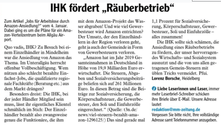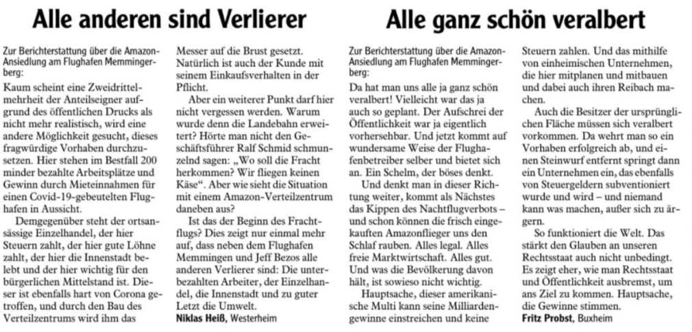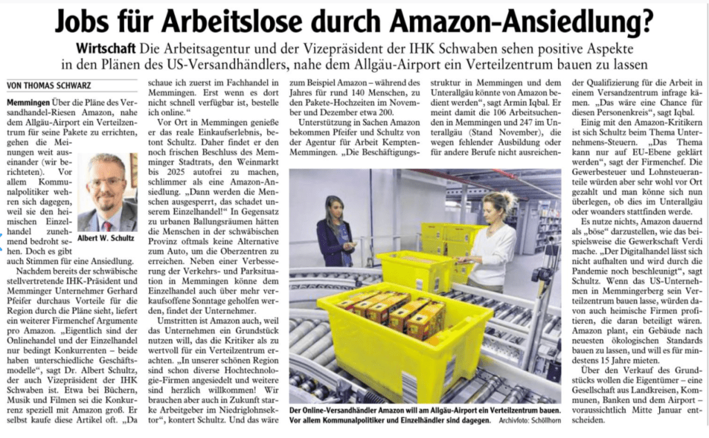 So wie es ausschaut, wird sich amazon am Flughafen in Memmingerberg ansiedeln. Im Stadtrat Memmingen gab es keine Diskussion, weil das „Grundstückgeschäft“ in dieser Form nicht zustande kommt.