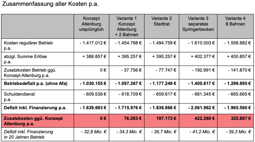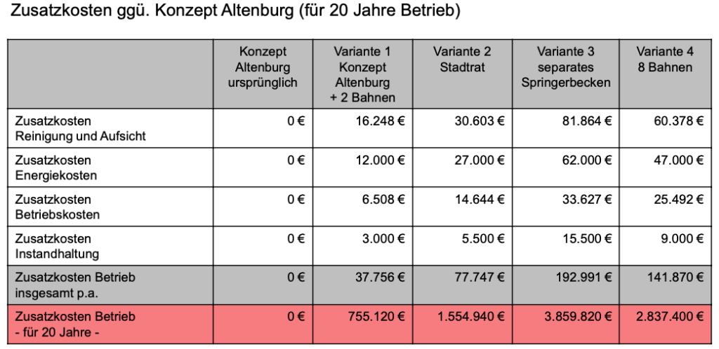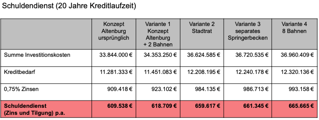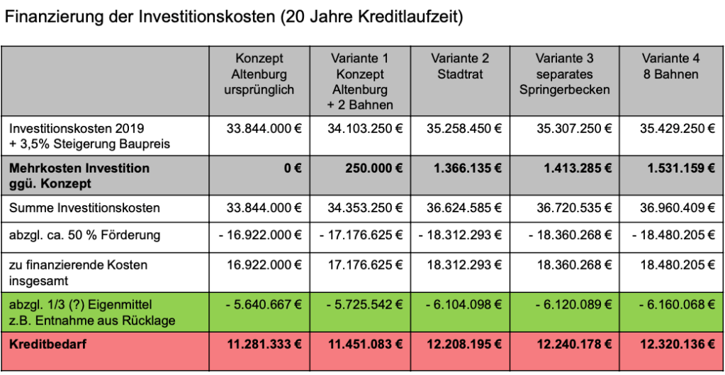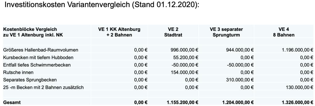 Zum Verständnis: die Investitionskosten „VE1 Altenburg“ belaufen sich auf 33.844.000 Millionen. Der Stadtrat hat in seinen „Sitzungen“ im Dez. 2019 und Jan. 2020 „VE2 Stadtrat“ ein größeres Hallenbad Raumvolumen beschlossen.
