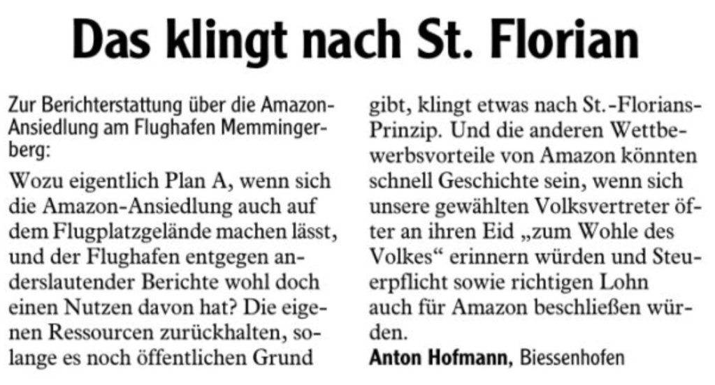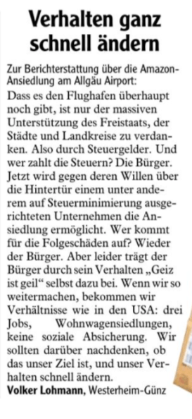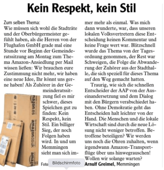 Die Entscheidung bzw. Nicht-Entscheidung hat zu vielen Leserbriefen in der Memminger Zeitung geführt. Es lohnt sich, sich mehr mit Amazon auseinanderzusetzten:
