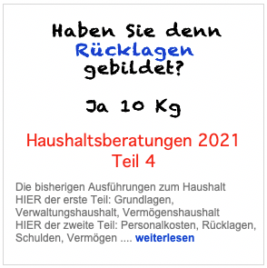 Hier der 2. Teil der Erläuterungen zum Haushalt 2021. Zuerst das Thema Personalkosten, dann die Themen Schulden, Rücklagen, Kreditaufnahme und Vermögen der Stadt.