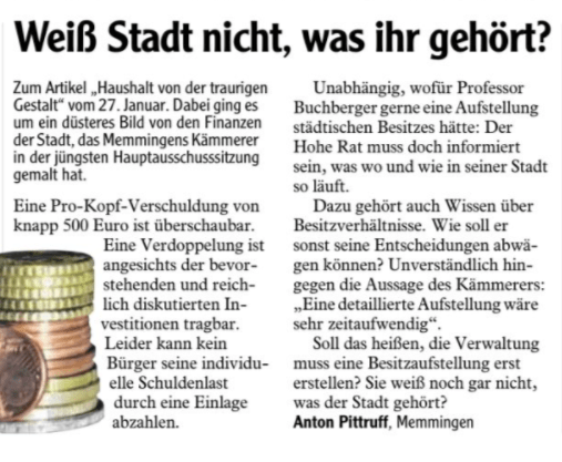 - wir fordern endlich eine genaue Besitzaufstellung der Stadt zu erstellen (wir wundern uns immer wieder was es in Memmingen nicht gibt und eigentlich selbstverständlich ist) und diese jährlich fortzuschreiben: erst dadurch wird eine fundierte Diskussion über Kreditaufnahmen möglich. Alle Gebäude, alle Grundstücke, alle Erbbaurechte, alle Beteiligungen, alle Stiftungen, usw. jeweils mit aktuellem Wert.