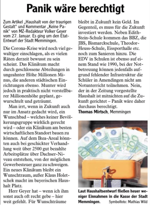 Von daher zeigt sich, dass der Haushalt 2021 trotz der schwierigen Ausgangslage ein für Memmingen (es sind hier doch mehrheitlich sparsame Schwaben) mutiger Entwurf ist. Es werden nahezu alle angedachten Maßnahmen weiter verfolgt.