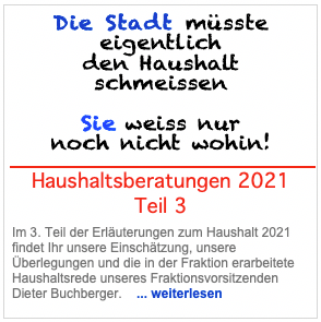 Im 3. Teil der Erläuterungen zum Haushalt 2021 findet Ihr unsere Einschätzung, unsere Überlegungen und die in der Fraktion erarbeitete Haushaltsrede unseres Fraktionsvorsitzenden Dieter Buchberger.