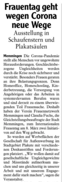 Motto: Internationaler Frauentag in Memmingen trotz(t) Corona – 8. März 2021 (Erstellt von der Gleichstellungsbeauftragten | 25.02.2021)