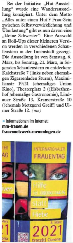 Die von Frauennetzwerk Memmingen e.V. und der Gleichstellungsbeauftragten der Stadt MM konzipierte Wanderausstellung Alles unter einen Hut!? Frau-Sein zwischen Selbstverwirklichung und Überlastung hat eine „Kleine Schwester“. Eine Auswahl an Roll-Ups zeigen wir als Ausstellung to go in verschiedenen Schaufenstern in der Innenstadt.