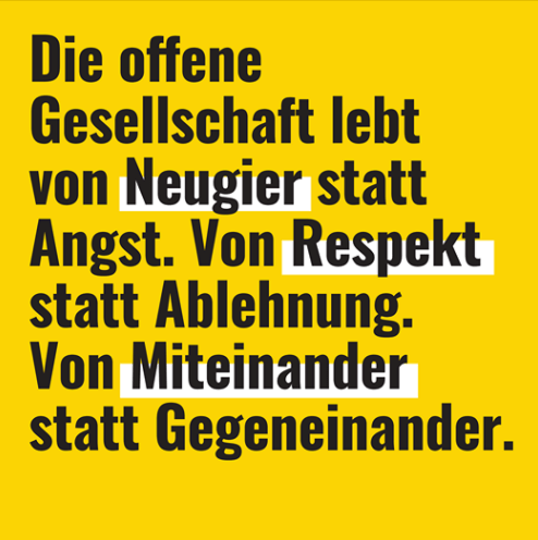 Es gibt eine Initiative „offene Gesellschaft“. Meinungsfreiheit, Glaubensfreiheit, Gleichberechtigung – all das gibt es nur in einer offenen Gesellschaft. Wir dürfen Traditionen hochhalten oder Neues denken. Wir dürfen provinziell sein oder weltgewandt. Oder all das auf einmal. Die offene Gesellschaft ist eine historisch einmalige Erfolgsgeschichte. Wir wollen sie in bewegten Zeiten verteidigen und weiterentwickeln.