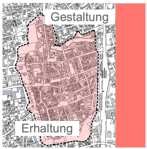 - Erhaltungsziel: die „Kleinteiligkeit bzw. vorhandene Körnung der umgebenden Bebauungsstruktur zu berücksichtigen. Auf vorhandene Sichtbezüge ist in besonderem Maße Rücksicht zu nehmen“.