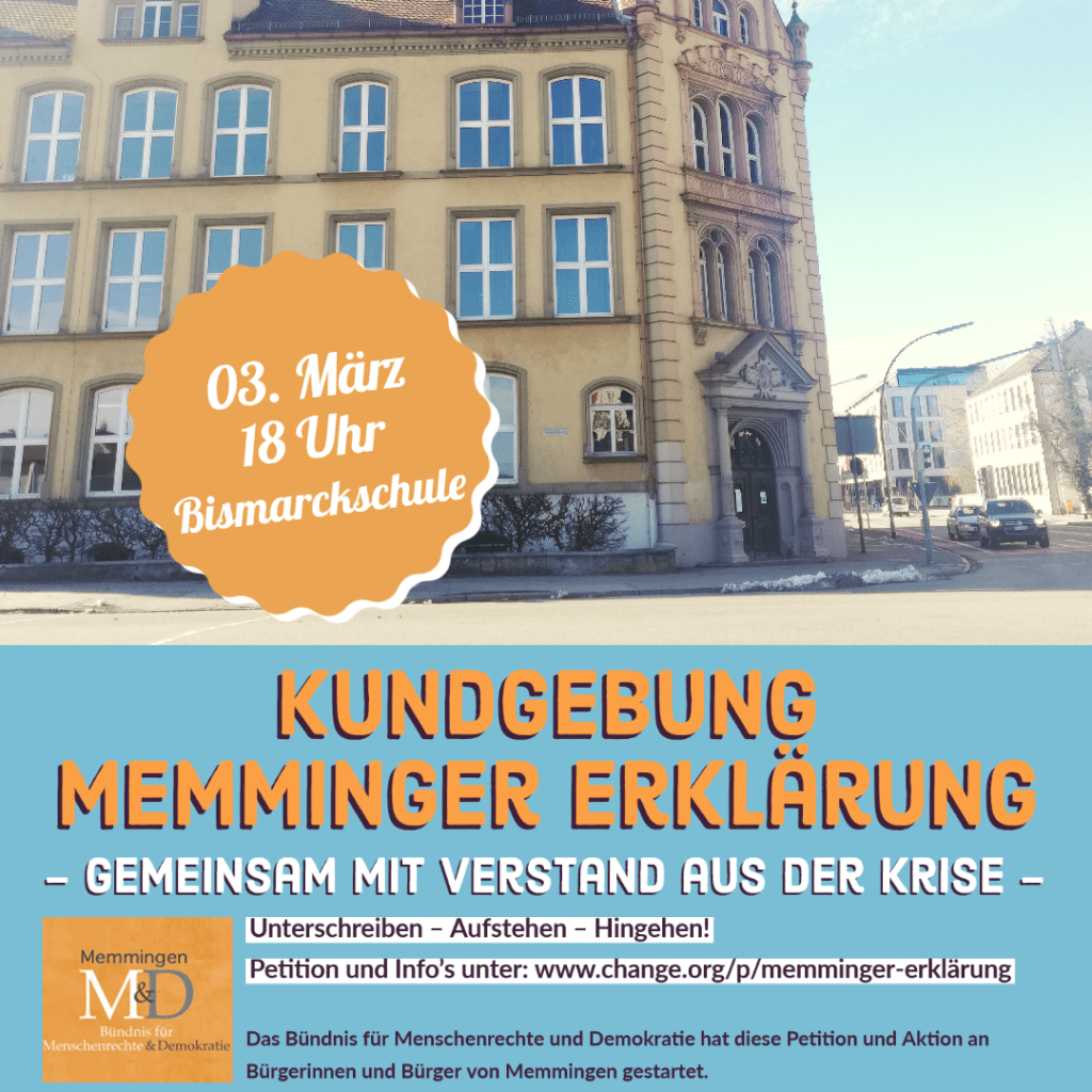 Die Memminger Erklärung kann weiterhin unterschrieben werden. HIER alle weiteren Infos. Am Donnerstag den 03.03.2022 findet um 18 Uhr die nächste (dritte) Kundgebung dazu bei der Bismarckschule statt.