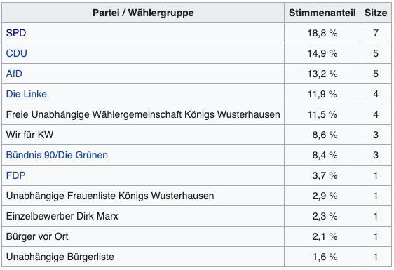 Die Zusammensetzung des Gemeinderates ist sehr vielfältig. Es gibt keine eindeutigen Mehrheiten. SPD, CDU und vor allem Die Linke. haben bei den letzten Kommunalwahlen (2019) sehr verloren. Gewonnen haben vor allem die „Freie Wählergemeinschaft“, die AFD und Bündnis90/Die Grünen.