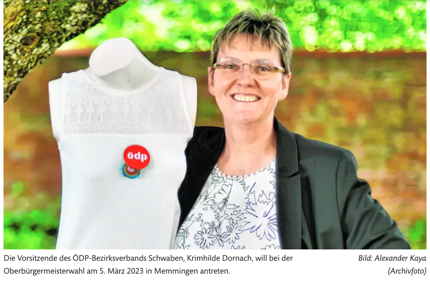 Krimhilde Dornach wurde im Jahr 1966 geboren, sie wuchs in Füssen auf. Sie lernte verschiedene Instrumente und übernahm mit 14 Jahren erstes ehrenamtliches Engagement. Sie ist Fachlehrerin für Musik und Werken und unterrichtet seit 1987; derzeit in Weißenhorn, wo sie auch wohnt. In der ÖDP wurde sie 2013 Mitglied und ein Jahr später Beisitzerin im Ortsverband Weißenhorn, 2016 dann im Kreisverband Neu-Ulm. Seit dem Jahr 2020 ist sie Vorsitzende des Kreisverbandes Neu-Ulm und des Bezirksverbandes Schwaben. Sie ist Kreisrätin. „Sie „Ich fühle mich in der Lage, als Oberbürgermeisterin von Memmingen meine „Frau zu stehen“. Sie wolle Politik mit Tiefgang und stehe für Transparenz und Dialog mit Bürgern. In allen Bereichen gibt es große Herausforderungen: Klimawandel, Inflation, Energiekrise, Gesundheitssystem, Wohnungsnot, Fachkräftemangel, Kinder- und Altersarmut, Flächenfraß. Neue Perspektiven zu entwickeln ist ihr ein wichtiges Anliegen. Das möchte Dornach über eine am Gemeinwohl orientierte Politik erreichen, „mit Ehrlichkeit, Mut, Vertrauen und Entschlossenheit“, wie sie sagt..