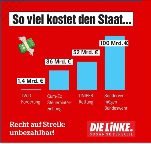 Text Susi Ferschl: „Bisher gibt es kein Ergebnis bei den Verhandlungen im öffentlichen Dienst. Bund und VKA auf Arbeitgeberseite sperren sich gegen einen Inflationsausgleich für die Beschäftigtem, die jeden Tag unfassbar wichtige Arbeit leisten. Doch die Kolleg*innen haben mit ihrer Gewerkschaft ver.di bereits gezeigt, dass sie sich nicht unterkriegen lassen und solidarisch vereint für mehr Respekt auf dem Lohnzettel kämpfen. Dabei haben sie weiterhin meine volle Unterstützung! Denn: Geld ist genug da. Die Frage ist nur, für was wird es ausgegeben…“