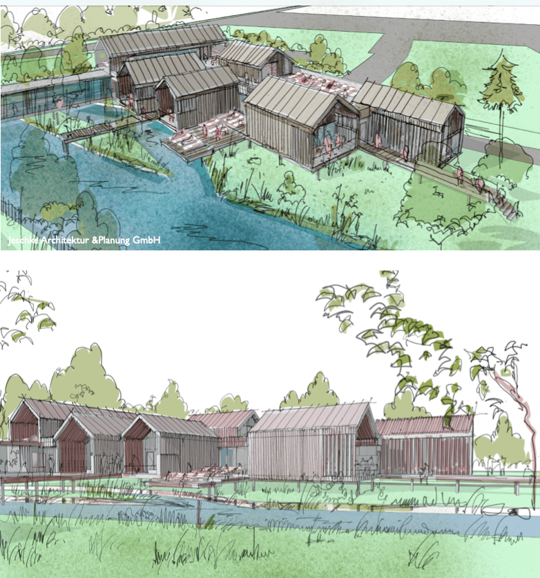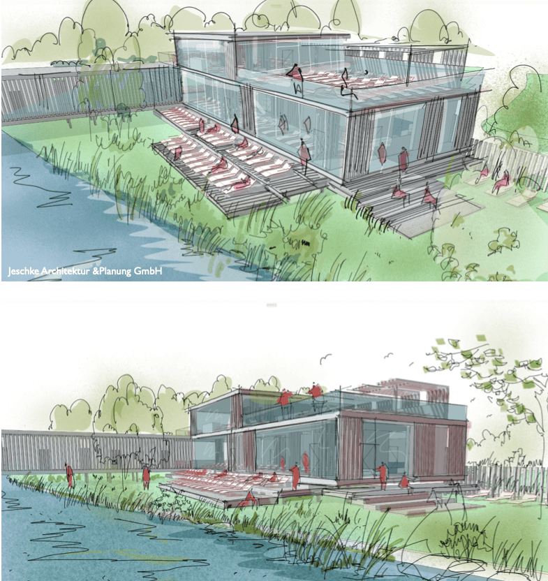 Es gibt verschiedene Varianten, mit kleiner Gastronomie oder mit größerer Gastronomie, mit eigenem Eingang, mit Eingang über das Kombibad oder mit beidem. Es wird auf jeden Fall einen Steg über den Bach geben.