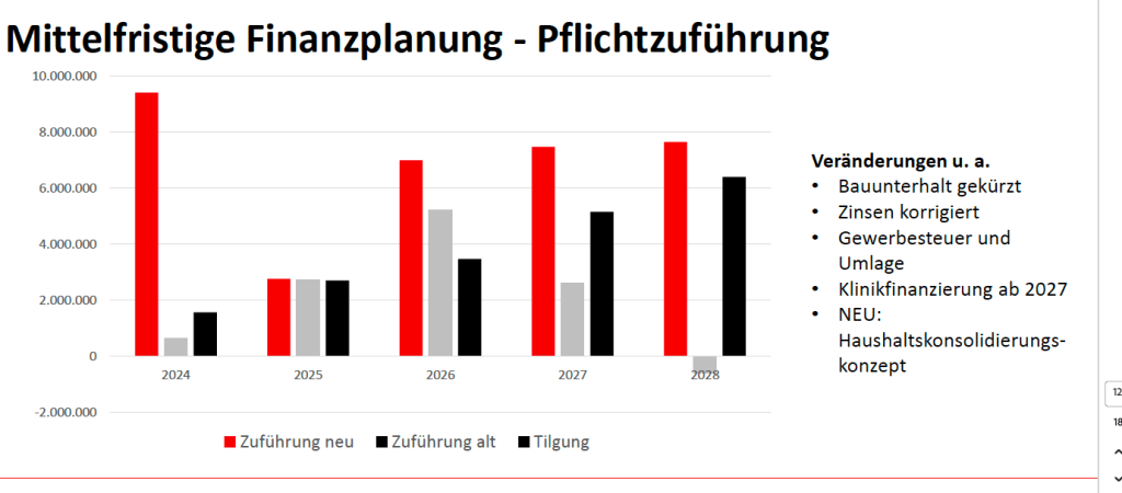 Dies zeigt die mittelfristige Zuführung vom Verwaltungs- in den Vermögenshaushalt. In 2024 waren es durch die höhere Einkommsteuereinnahmen 9,4 Mio. Euro (geplant unter 1 Mio. Euro) in 2025 sind es 2,7 Mio. Euro, in den nächsten Jahren sollen es 7-8 Mio. Euro sein. Der hellgrau Balken zeigt die bisher geplante Zuführung, wieso sich die Zahlen verändern wird im Text rechts erläutert.