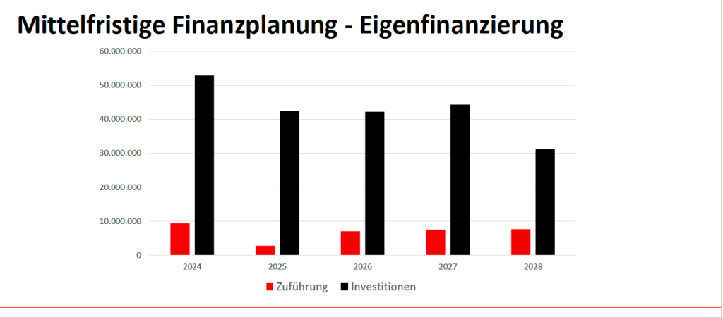 Hier wird das Verhältnis der Zuführungen in den Vermögenshaushalt im Verglich zu den Investitionen angezeigt. Die Zuführungen machen auch bis 2028 einen sehr geringen Anteil aus, wobei die Schere kleiner werden soll. Aber auch die nächsten Jahre muss ein Großteil der Investitionen über Kredit finanziert werden.
