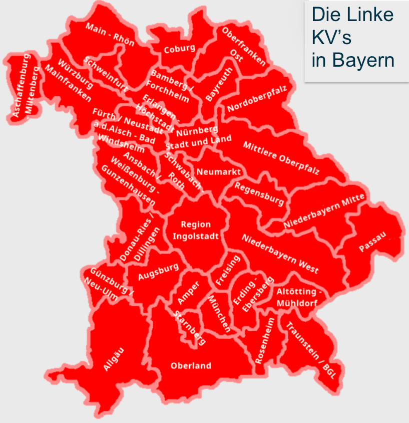 Die Linke – ist wie jede andere Partei in Kreisverbänden organisiert. Da die Partei bisher vor allem im ländlichen Raum und insgesamt in Bayern nicht sooo extrem stark war, sind die KV’s ziemlich groß. Der KV Allgäu ist besonders groß. Es umfasst die Lanskreise Lindau, Oberallgäu, Ostallgäu und Unterallgäu, die Städte Lindau, Kempten, Sonthofen, Kaufbeuren, Memmingen, Mindelheim.