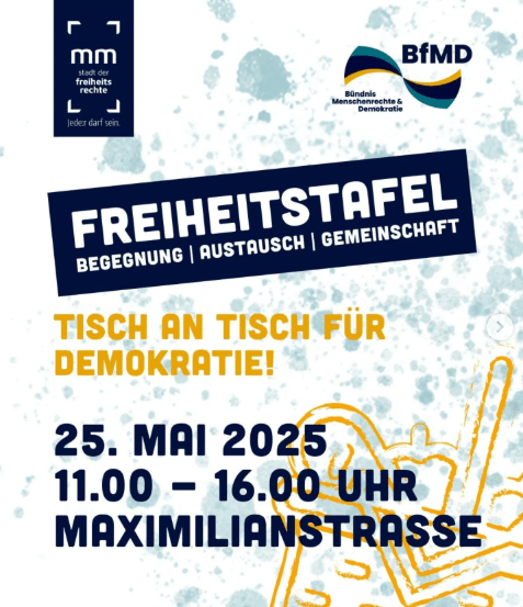 Am 25. Mai 2025 verwandelt sich die Maximilianstraße in Memmingen in eine lange Freiheitstafel – ein Ort für Begegnung, Austausch und Miteinander.