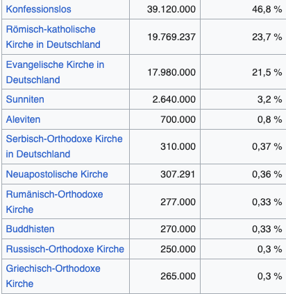 Die Religionszugehörigkeit in Deutschland hat sich in den letzten Jahrzehnten stark verändert, vor allem durch die zunehmende Säkularisierung und die Zuwanderung von Menschen aus unterschiedlichen kulturellen und religiösen Kontexten. Hier die Zahlen von 2021