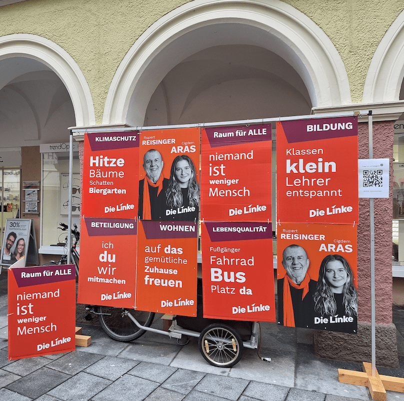 Heute war der erste Infostand. Der LINKE Infostand ist so einfach wie auffällig. Mit unseren Plakaten haben wie eine „Plakatwand erstellt, ein wirklicher Blickfang. Davor einen Tisch mit Infomaterial. das wars. Alles hat auf einem Fahrradanhänger Platz (man sieht ihn unter den Plakaten). Damit sind wir flexibel und äusserst ökologisch unterwegs – wahrscheinlich als einzige Partei.