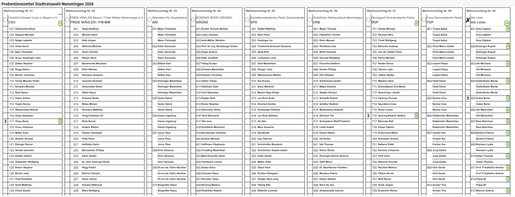 Hier seht ihr den Probewahlzettel mit Verteilung der Stimmen auch auf andere Parteien