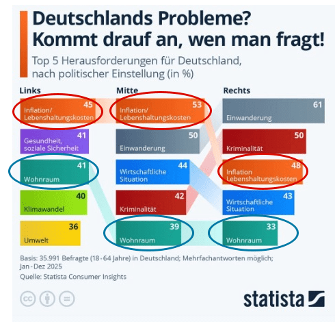Dies sind Quer durch alle Lager auch die Probleme der Menschen. Beide Probleme sind unter den fünf Wichtigsten laut der Umfrage unten.