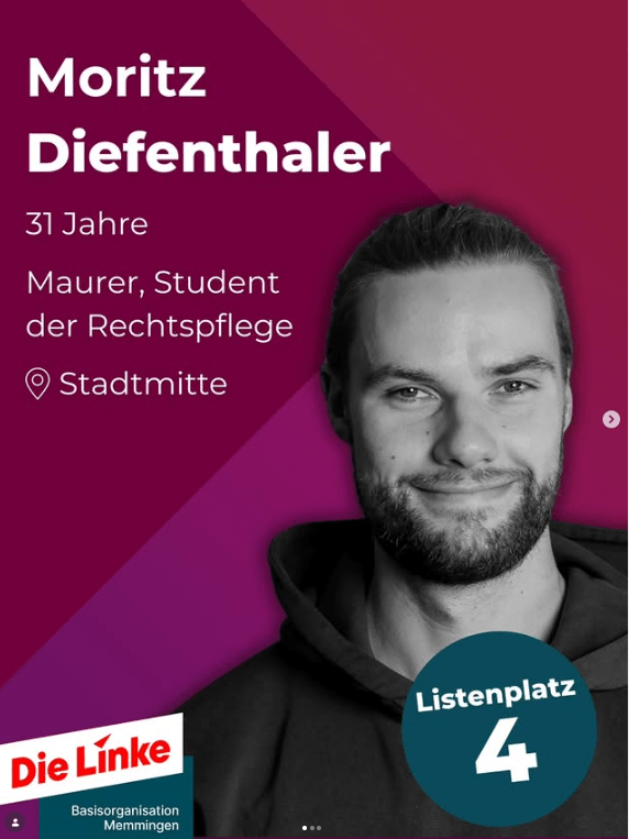 | 4 | Moritz Diefenthaler | 31 Jahre | Maurer, Student der Rechtspflege |