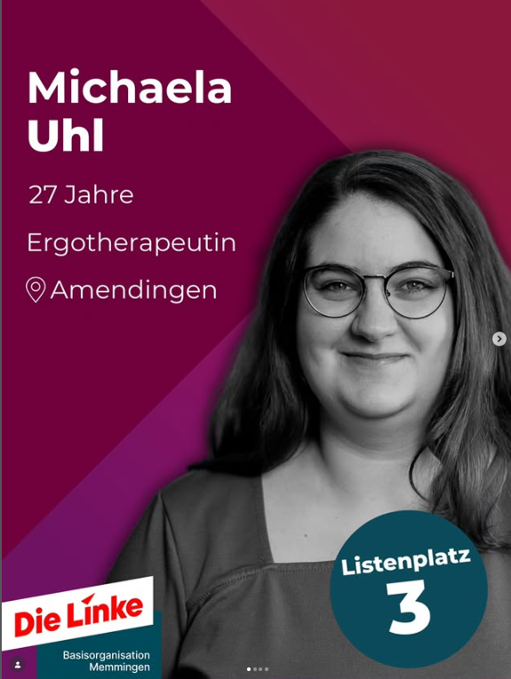 ![]() | Platz 3 Michaela Uhl, 27 Jahre Ergotherapeutin Schwerpunkte: Gleichstellung und Chancengleichheit, Barrierefreiheit, Pflege, Gesundheit, Familien, Antifaschismus, Demokratie Mitglied: ecdc Memmingen, Evangelische Gemeindejugend Memmingen, VERDI |