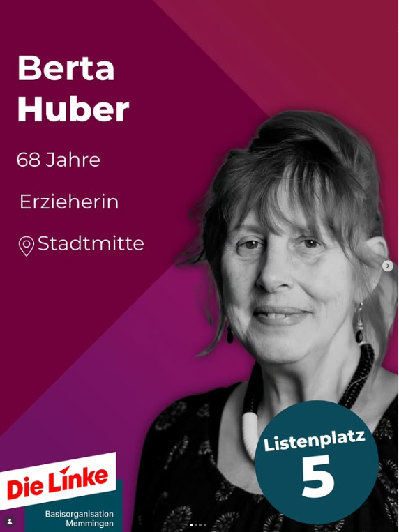 ![]() | Platz 5 Berta Huber, 68 Jahre Erzieherin Schwerpunkte: Gleichstellung, Kultur, gesellschaftliche Teilhabe Mitglied: Frauennetzwerk MM e.V. Vorstand, Verein zum Schutz misshandelter Frauen und Kinder, GEW, Förderverein MM Bäder, Frauengeschichtswerkstatt, Natur statt Deponie e.V., attac, BfMD, KIMM, |
