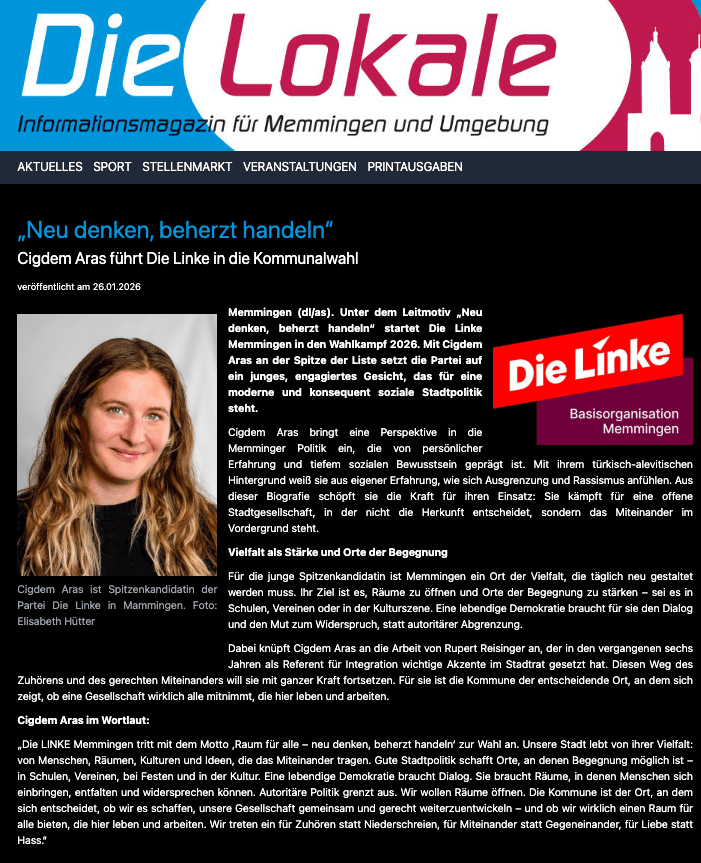 Memmingen (dl/as). Mit einer ungewöhnlich jungen und international geprägten Liste gehen die Memminger Linken in die Stadtratswahl. Die Spitzenkandidatin Cigdem Aras setzt auf frischen Schwung und politische Vielfalt. Auch im Unterallgäu will die Partei erstmals in mehrere Kommunalparlamente einziehen.